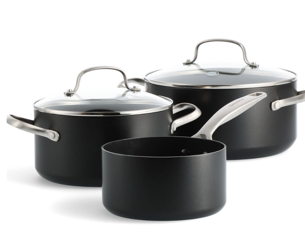 Dankzij de robuuste aluminium behuizing en de roestvrijstalen handgrepen zijn de pannen licht van gewicht en toch bijzonder stevig. Ze zijn geschikt voor alle warmtebronnen, inclusief inductie, en kunnen zonder zorgen in de oven.