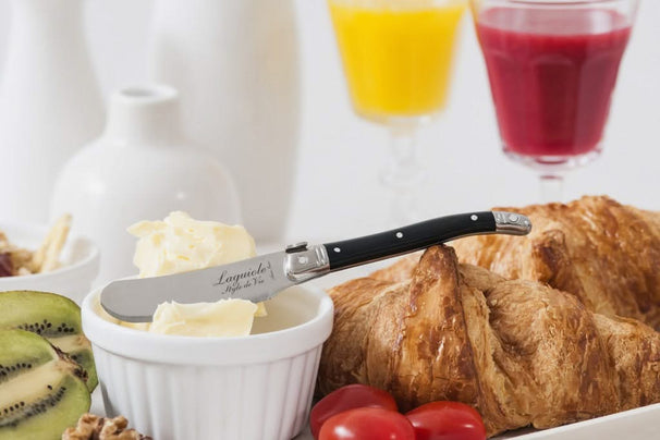 Met de Laguiole Style de Vie Botermessen smeer je boter, kruidenboter en zachte spreads met stijl en gemak. Deze luxe botermessen, gemaakt van hoogwaardig roestvrij staal en verkrijgbaar met handgrepen in zwart, parelmoer, olijfhout en dark wood, zijn een elegante toevoeging aan elke ontbijttafel of borrelplank. Dankzij het brede lemmet en de afgeronde punt verdeel je boter moeiteloos over brood, crackers of toast.