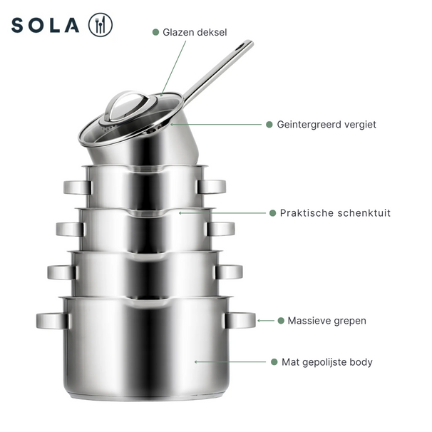 Sola Pannenset Juvia - RVS - Kookpan ø 16, 18, 20, 24 cm & Steelpan ø 16 cm - Inductie & Downdraft geschikt - 5 Delig