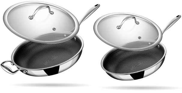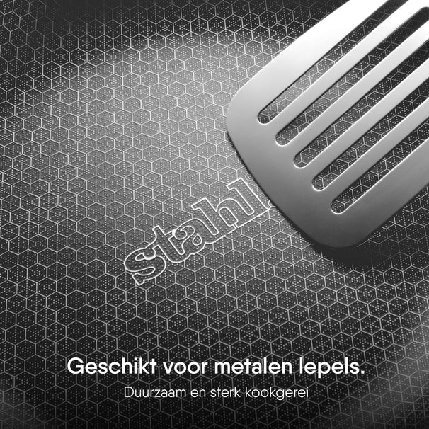 De Hybrid-serie van Stahl Cookware maakt gebruik van een unieke honingraatstructuur op de bodem van de pan. Deze structuur zorgt voor een optimale warmteverdeling en voorkomt dat ingrediënten aan de pan blijven kleven. Bovendien zijn de pannen volledig PFAS- en PFOA-vrij, waardoor je met een gerust hart kunt koken zonder schadelijke stoffen. De duurzame materialen en robuuste constructie maken de pannen geschikt voor alle warmtebronnen, inclusief inductie, en zorgen voor een lange levensduur.