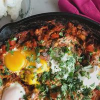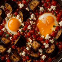 Shakshuka met aubergine en feta is een smaakvol eenpansgerecht waarin gepocheerde eieren sudderen in een pittige tomatensaus met paprika, aubergine, en kruiden. De saus wordt op smaak gebracht met ras el hanout, terwijl verkruimelde feta en verse koriander het gerecht afmaken. Deze Marokkaanse klassieker is makkelijk te bereiden en perfect om te serveren in een tajine voor een authentieke touch.