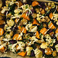 Zoete aardappel en bloemkool uit de oven met knoflook en rozemarijn is een simpel en smaakvol gerecht. De in blokjes gesneden zoete aardappel, bloemkoolroosjes en rode ui worden gemengd met een marinade van olijfolie, citroensap, knoflook en rozemarijn. Na 25 minuten in de oven ontstaat een heerlijke, geroosterde maaltijd met een frisse en kruidige smaak.
