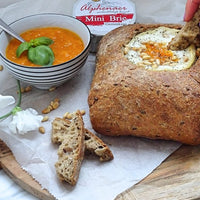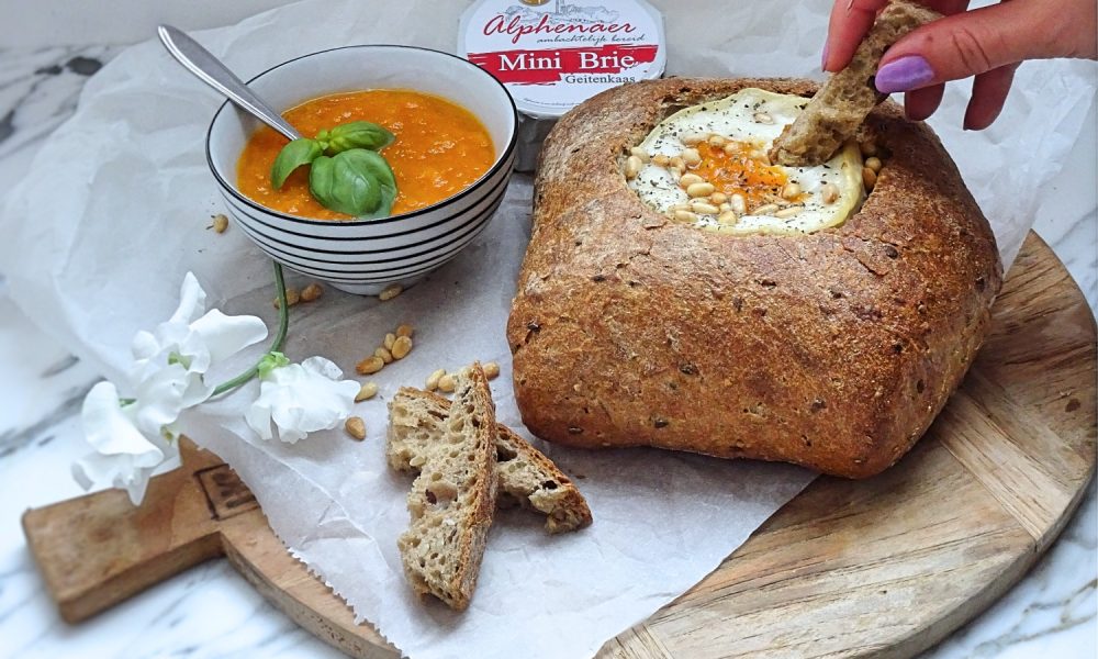 Zomerse kaasfondue in een brood met geitencamembert en abrikozencompote