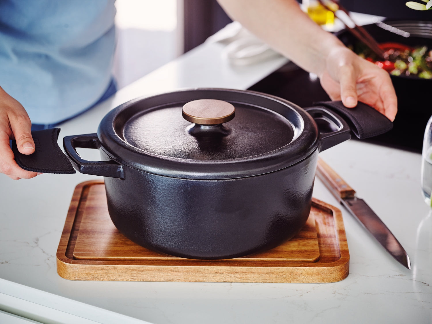 Til hete gietijzeren Nori-items moeiteloos op met deze set van 2 leren handvatten