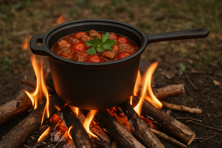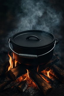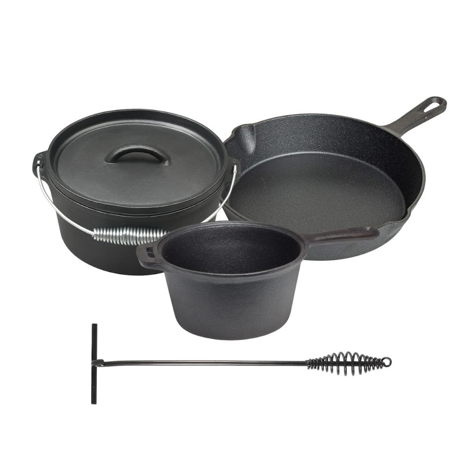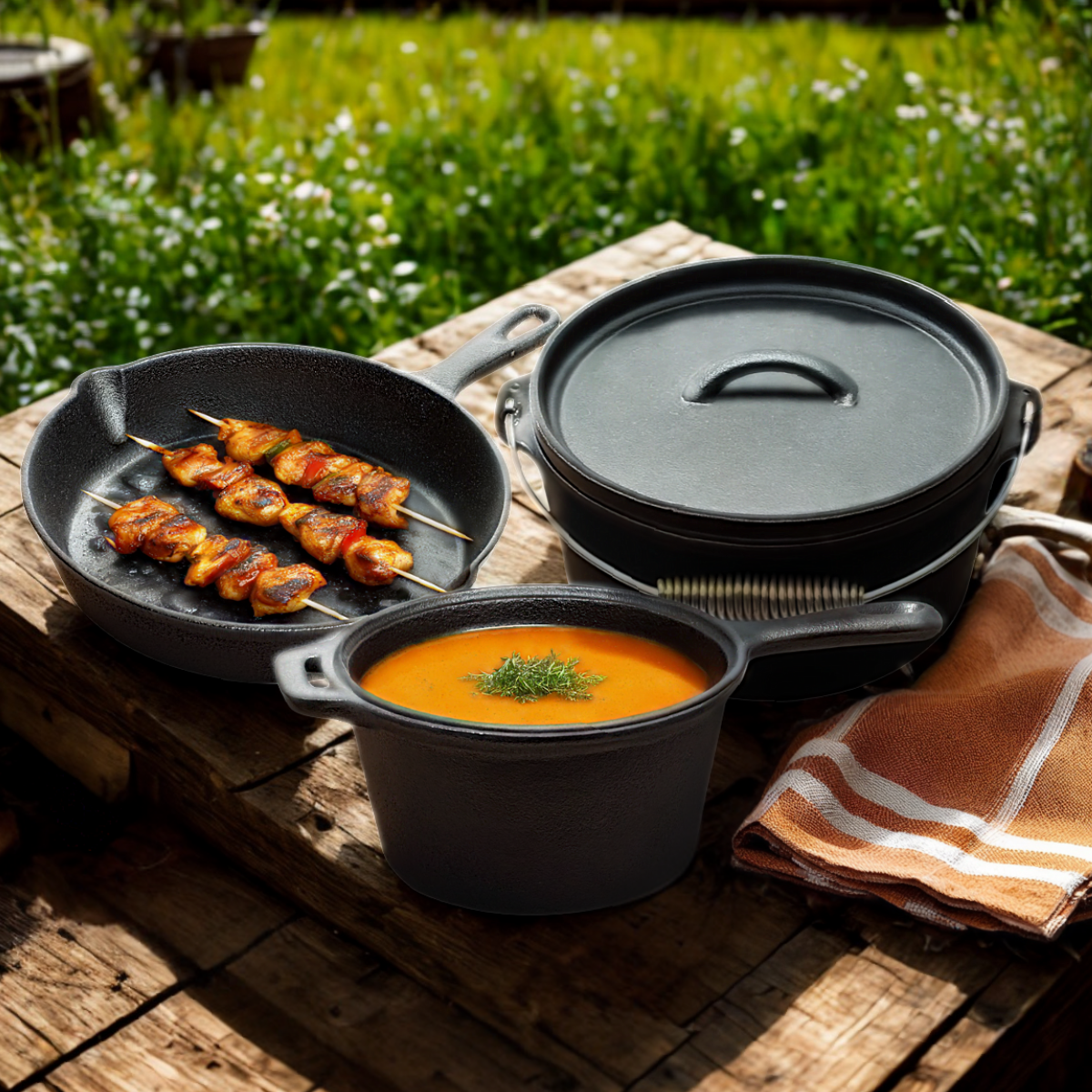 Gietijzer staat bekend om zijn gelijkmatige warmteverdeling en duurzaamheid. Na het inbranden (seasoning) ontstaat een natuurlijke anti-aanbaklaag, waardoor je gerechten perfect bereid worden. Bovendien is deze set hittebestendig en geschikt voor direct vuur, wat hem ideaal maakt voor buitengebruik.