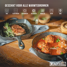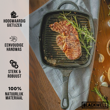Omdat deze Blackwell grillpan geen anti-aanbaklaag heeft, is het belangrijk om deze Blackwell grillpan te seasonen. Handwas en direct afdrogen wordt aanbevolen om de kwaliteit van het gietijzer te behouden en om roestvorming te voorkomen.