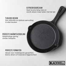 Omdat deze Blackwell koekenpannen geen anti-aanbaklaag hebben, is het belangrijk om deze Blackwell koekenpannen te seasonen. Handwas en direct afdrogen wordt aanbevolen om de kwaliteit van het gietijzer te behouden en om roestvorming te voorkomen.