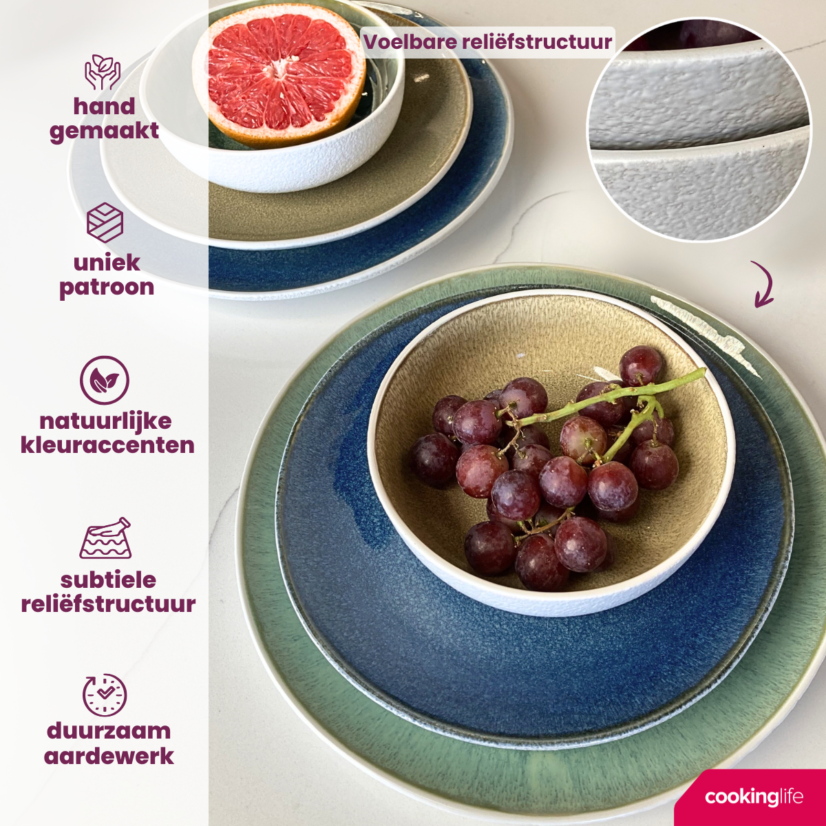 Door de reactieve glazuurlaag kunnen kleurverschillen ontstaan: elk serviesonderdeel is daardoor uniek. De onderkant van de Cookinglife Ontbijtborden Belize-collectie is wit en voorzien van een subtiele reliëfstructuur.