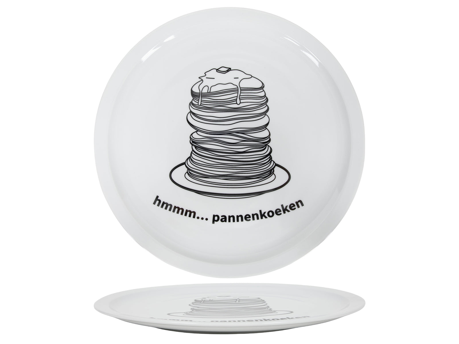 Deze set van zes pannenkoekenborden is speciaal gemaakt voor het ultieme pannenkoekenmoment. Elk bord heeft een royaal formaat van 30 cm zodat je stapels pannenkoeken mooi kunt presenteren. Op elk bord staat een zwarte illustratie van een stapel pannenkoeken en de tekst “hmmm... pannenkoeken” voor een speels en herkenbaar accent. Het porselein voelt fijn aan en geeft een vrolijke gastvrije uitstraling.