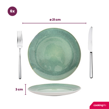 De Cookinglife Serviesset Belize biedt een complete tafelsetting voor 6 personen, bestaande uit 6 dinerborden (ø 25 cm), 6 ontbijtborden (ø 21 cm) en 6 soepkommen (ø 15 cm). Elk stuk is vervaardigd uit stevig aardewerk en afgewerkt met reactive glaze, wat zorgt voor een unieke, artisanale uitstraling. Deze set brengt de warmte en authenticiteit van handgemaakt servies naar je eettafel.