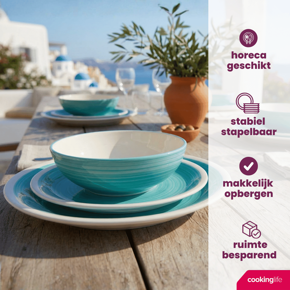 Cookinglife gelooft in kwaliteit die werkt - voor fijnproevers en snelle happers. De Oceanico Turquoise serviesset combineert kleur, vakmanschap en praktische eigenschappen zodat je vaker samen eet, proeft en geniet. Het is een slimme investering: stijlvol genoeg voor gasten, robuust genoeg voor dagelijks gebruik.