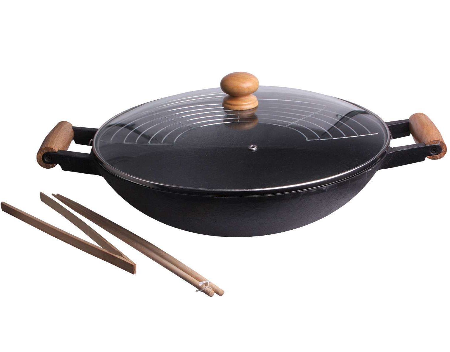 De Cookinglife Wokpan is een zware, robuuste wok van gietijzer met een royaal kookoppervlak. De pan heeft een geëmailleerde anti-aanbaklaag waardoor aanbakken minder snel voorkomt en reinigen eenvoudiger gaat. Je ontvangt de wok inclusief glazen deksel en twee houten tools, zodat je direct aan de slag kunt. De pan werkt op alle warmtebronnen en is geschikt voor grote porties en familie-eten.