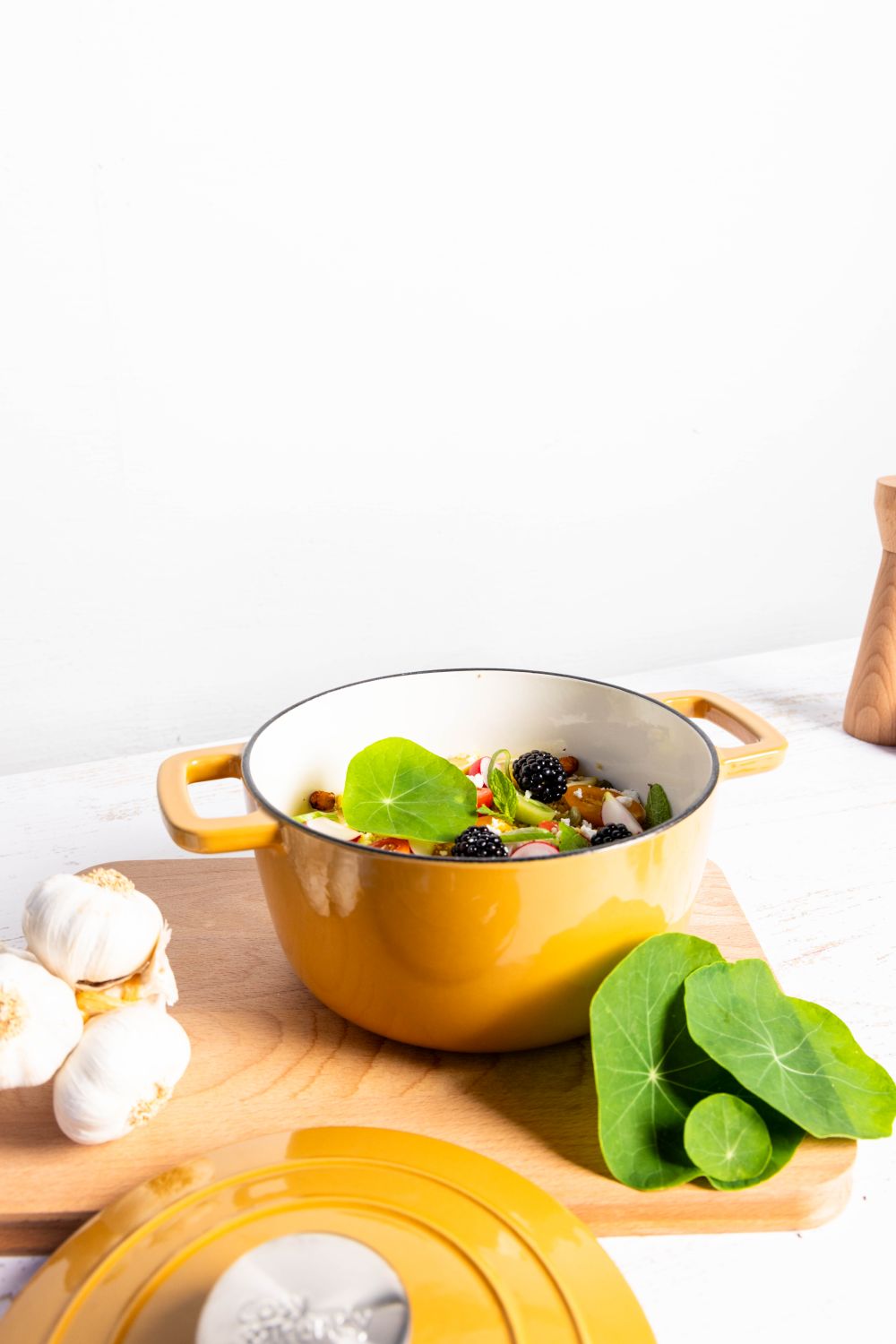 De geëmailleerde binnenkant zorgt voor een perfecte warmteverdeling en voorkomt dat het eten aanbrandt.