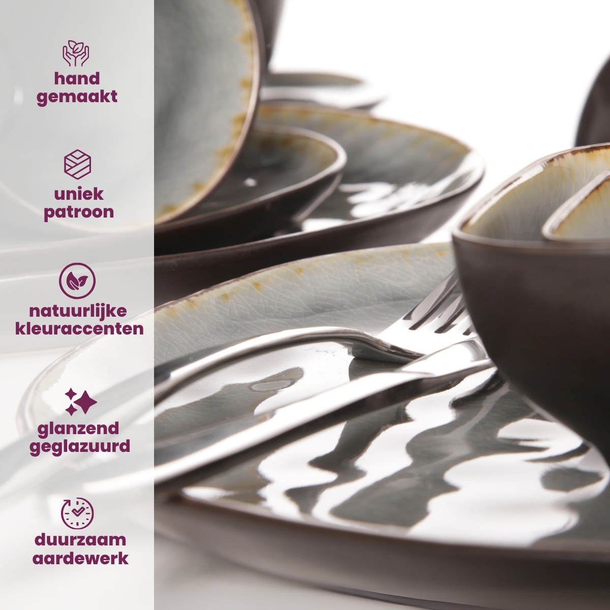 - Het servies uit de Cosy & Trendy Laguna Blue Grey-collectie is ovenbestendig. Om schade door temperatuurschokken te voorkomen, is het belangrijk om het servies geleidelijk te verwarmen. Zet het dus niet direct vanuit de koelkast in een hete oven. Zo blijft het servies lang mooi en functioneel.