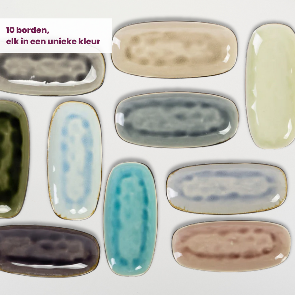 | Inhoud doos | 10 Rechthoekige Tapasborden 22.5 x 10 cm |
