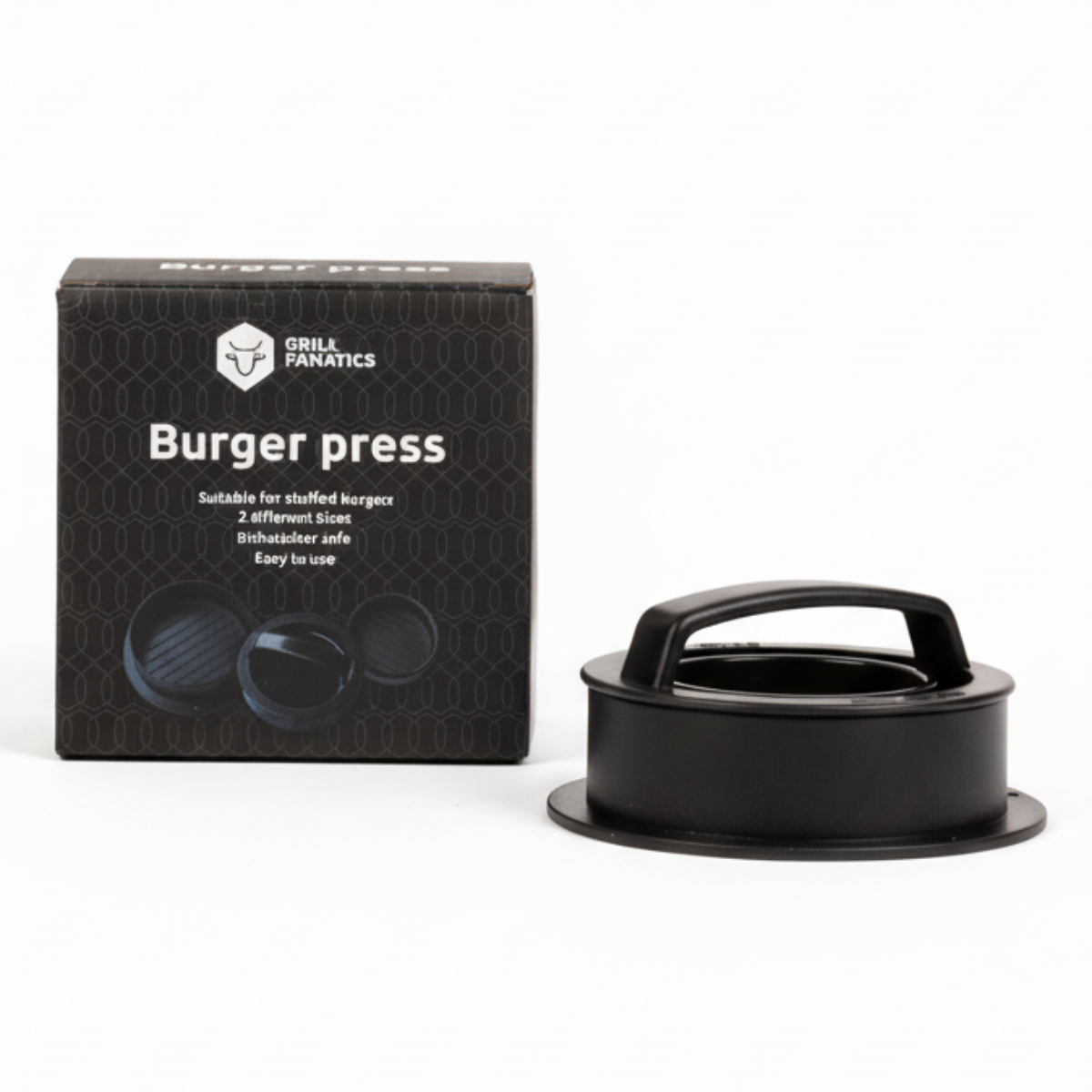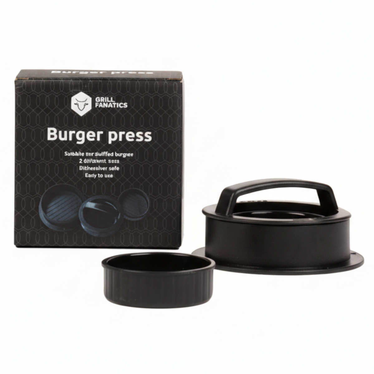 - 1x Grill Fanatics Hamburgerpers met twee maten (ø 10,5 cm en ø 6,5 cm)