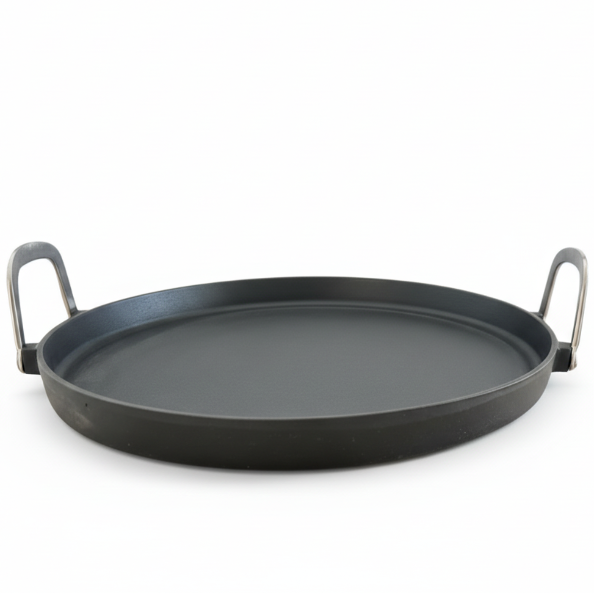 Het volledig gladde oppervlak is bewust zo ontworpen. Geen ribbels, geen groeven - puur vlak gietijzer. Dit geeft je totale controle. Garnalen die normaal tussen de spijlen van je rooster glippen? Geen probleem. Een delicate zeebaarsfilet die je in perfecte staat wilt serveren? Draai 'm rustig om zonder dat hij uit elkaar valt. Fijngesneden groenten voor een Aziatische stir-fry? Gooi ze erop en roer vrolijk door.