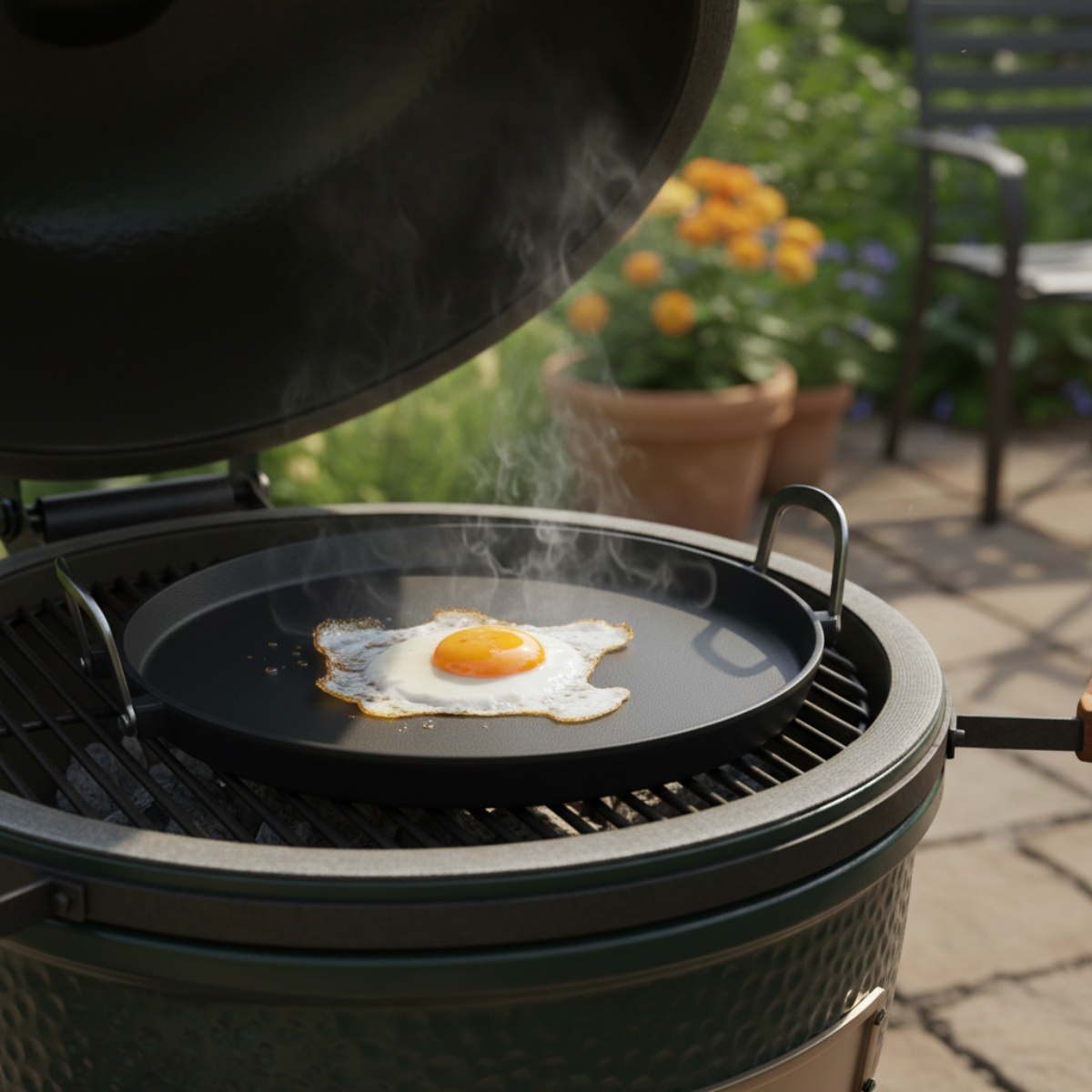 - Eieren en pannenkoeken - Ja, echt. Een ontbijtje op de kamado met gebakken eieren en spek? Met deze plancha kan het.
