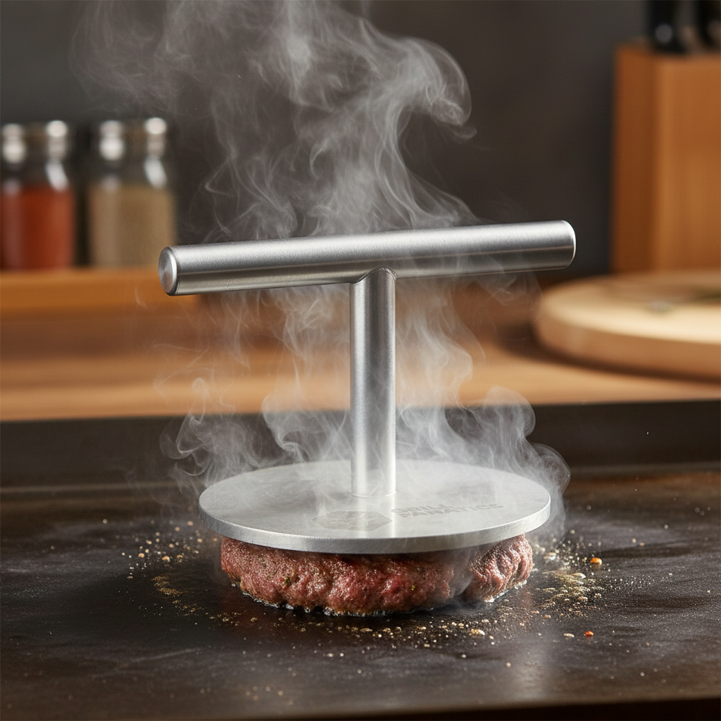 - 575 gram puur gewicht - Hier zit serieuze massa achter. Je hoeft nauwelijks kracht te zetten: het gewicht van de press doet het werk voor je. Leg hem op het vlees, druk stevig en gelijkmatig - klaar.