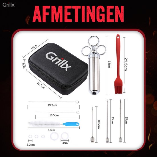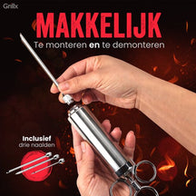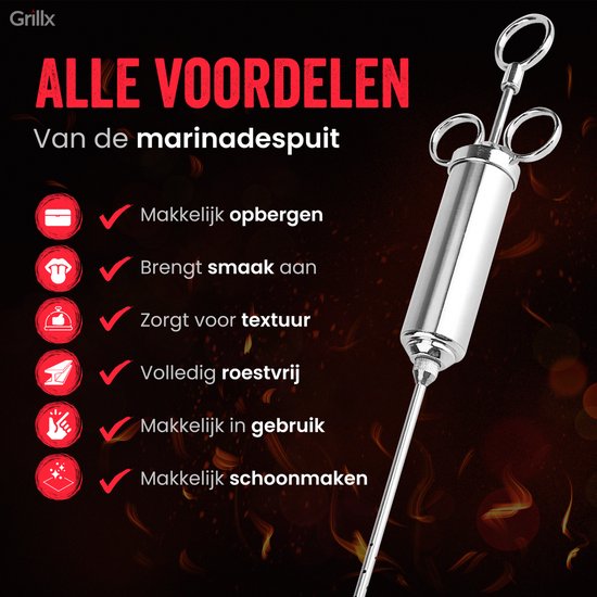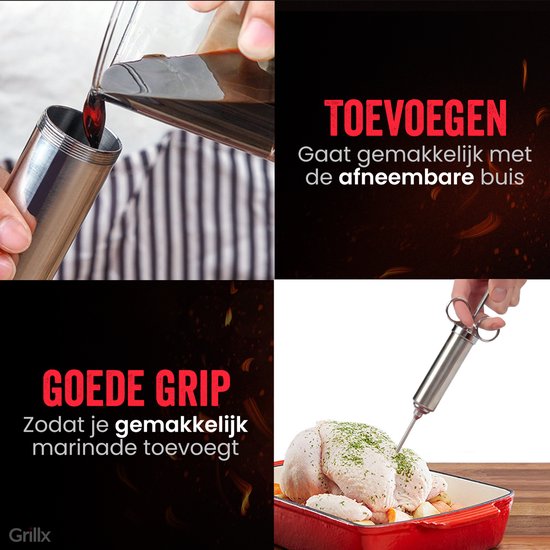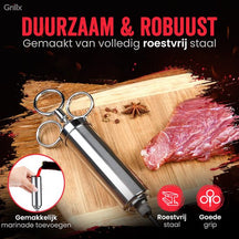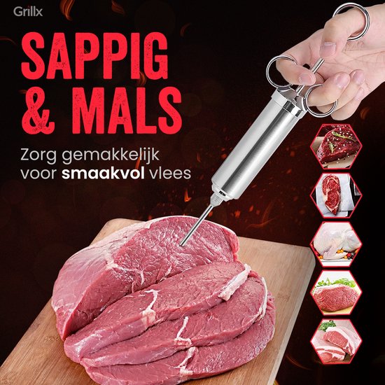 Breng jouw gerechten naar een hoger niveau en geniet van de heerlijke smaaksensatie met de GrillX Luxe Marinade Injectiespuit. Bestel nu en ontdek zelf alle voordelen van deze handige tool!