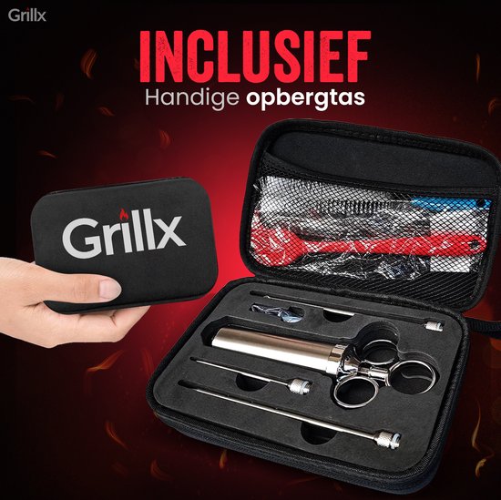 Met de GrillX Luxe Marinade Injectiespuit geef je jouw vlees een smaakvolle upgrade. Deze handige injectiespuit is speciaal ontworpen om heerlijke vloeistoffen in je vlees te injecteren, zoals marinades, boter en pekel. Met de drie verschillende naalden kun je elk soort vlees sappig houden tijdens het braden of barbecueën.