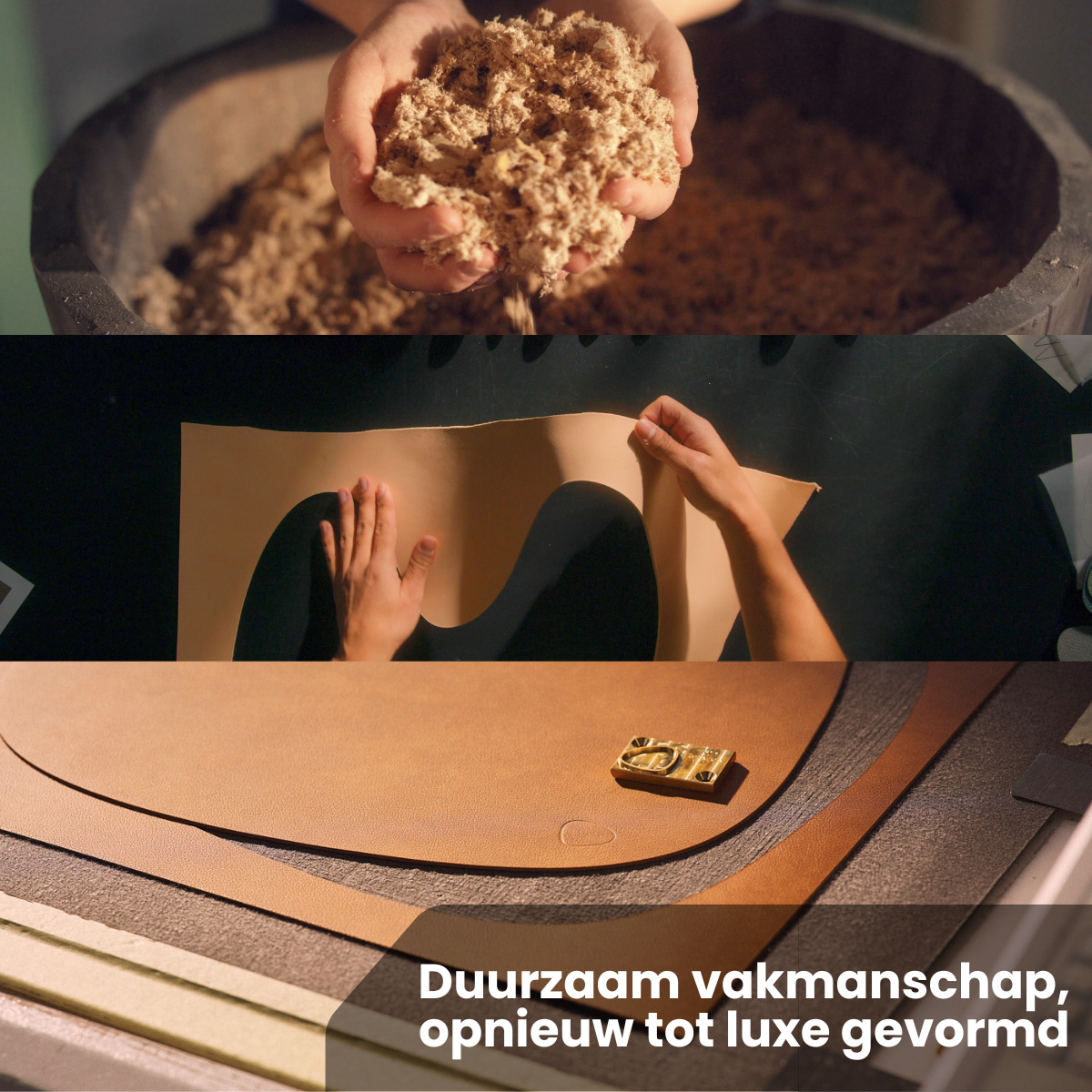 - Materiaal: 80% gerecycled leer, 20% natuurlijk rubber