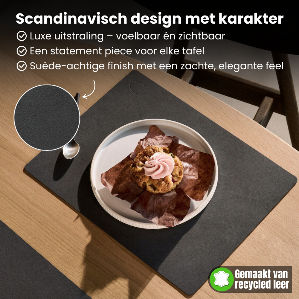 De LIND DNA Placemats Nupo – Truffle – 45 x 35 cm – 2 Stuks brengen een warme, natuurlijke touch op je eettafel. Gemaakt van echt leer, 80 % gerecycled leer en 20 % natuurlijk rubber. Deze placemats hebben een mooie leer oppervlakte en een zachte, soepele structuur. Het diepbruine “Truffle” kleurgebruik geeft een elegante, tijdloze uitstraling. De placemats beschermen je tafel tegen krassen, hitte en vlekken.