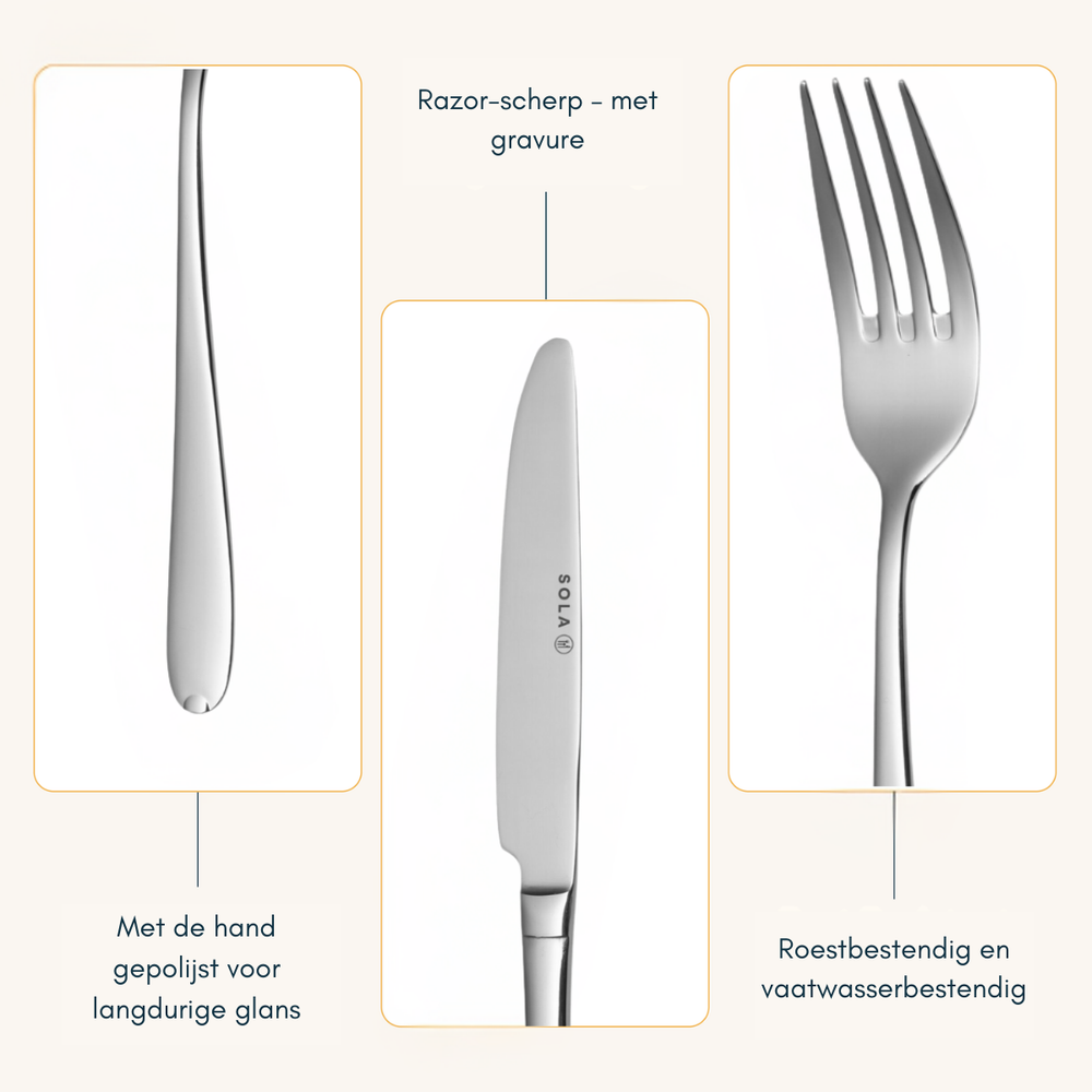 Sola bestek fleurie is gemaakt van zilverwit 18/10 edelstaal. Zilverwit edelstaal 18/10 is een staallegering van 18 delen chroomstaal en 10 delen nikkel. Door deze samenstelling is het bestek roestvrij en vaatwasser geschikt.