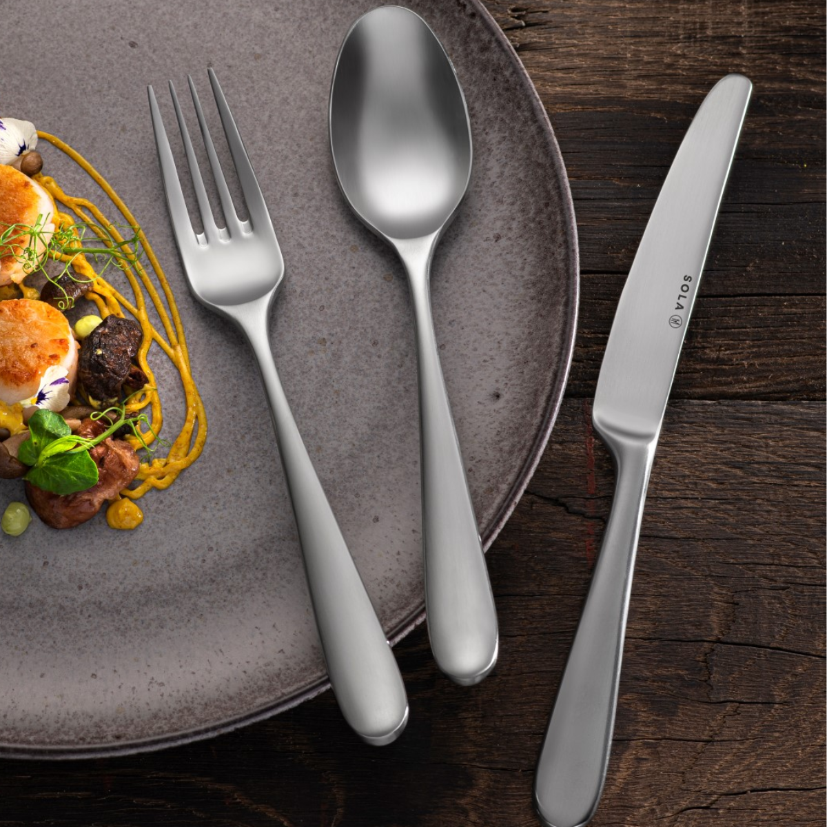 De Sola Nordica collectie is een stijlvolle en eigentijdse besteklijn, ontworpen met een focus op eenvoud en functionaliteit. Het minimalistische design en de mat geborstelde afwerking geven dit bestek een moderne en Scandinavische uitstraling, perfect voor een strak en trendy tafelsetting.