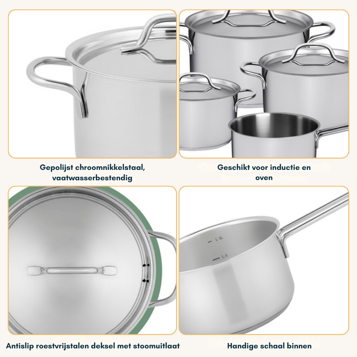 De pannen zijn gemaakt van hoogglans gepolijst roestvrij chroomnikkelstaal, wat zorgt voor een elegante uitstraling in je keuken. Het duurzame materiaal is bestand tegen intensief gebruik en behoudt zijn kwaliteit, zelfs na jarenlang koken.