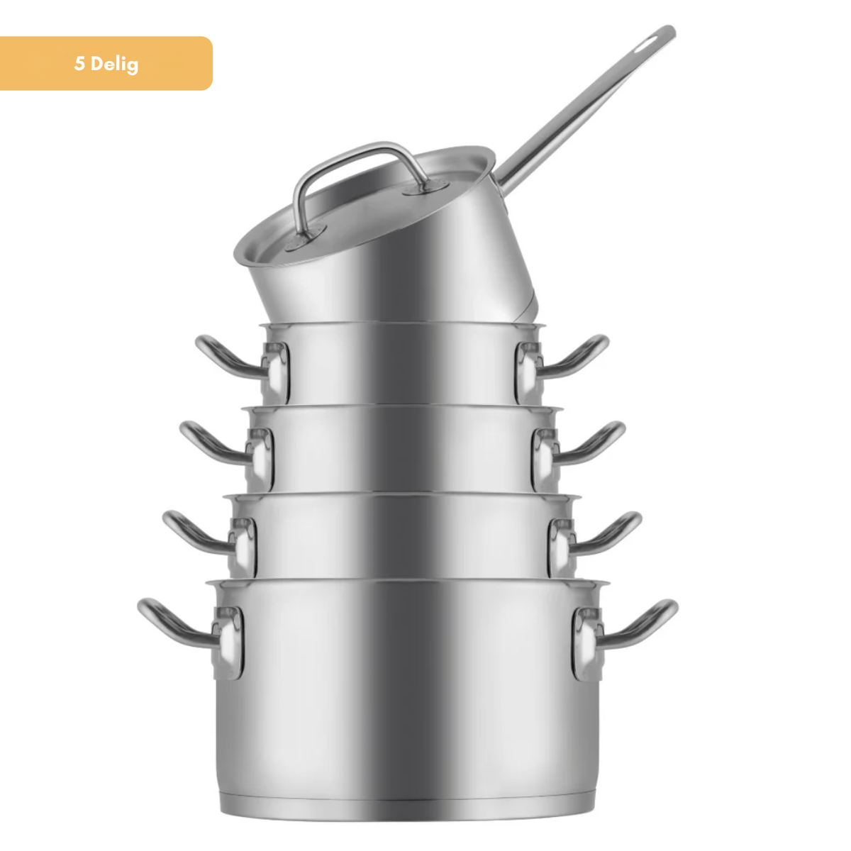 Het robuuste roestvrijstalen design geeft jouw keuken een professionele uitstraling. De pannen zijn niet alleen mooi om te zien, maar ook ontworpen voor langdurig gebruik. Dankzij de hoogwaardige materialen blijven ze jarenlang in topconditie, zelfs bij dagelijks gebruik.