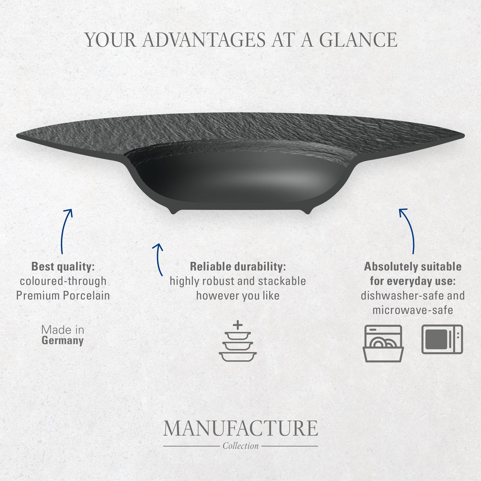 Mooi servies dat je elke dag gebruikt, moet ook elke dag bestand zijn. Villeroy & Boch weet dat als geen ander: de Manufacture Rock collectie is gemaakt van porselein dat stevig genoeg is voor dagelijks gebruik, maar licht genoeg om comfortabel te hanteren. Je legt het gewoon in de vaatwasser, je warmt resten op in de magnetron, en als je een gerecht in de oven afmaakt, kan dat tot 180 graden Celsius. Geen aparte pannen, geen gedoe, gewoon koken en serveren vanuit hetzelfde bord.