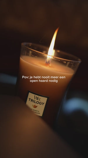 Stel je voor: na een lange dag kom je thuis, ploft op de bank en steekt de kaarsen aan voor wat extra gezelligheid. Wie wil er dan niet een heerlijke, huiselijke geur ruiken zodra de kaarsen aan het branden zijn? Geniet van een trilogy van de geuren Vanilla Bean, Caramel en Biscotti. De houten lont geeft een rustgevend knisperend geluid, alsof de haard aanstaat. Time to relax. Met deze WoodWick geurkaars geniet je ongeveer 50 branduren van een heerlijk geurende kaars, die alle zintuigen prikkelt.